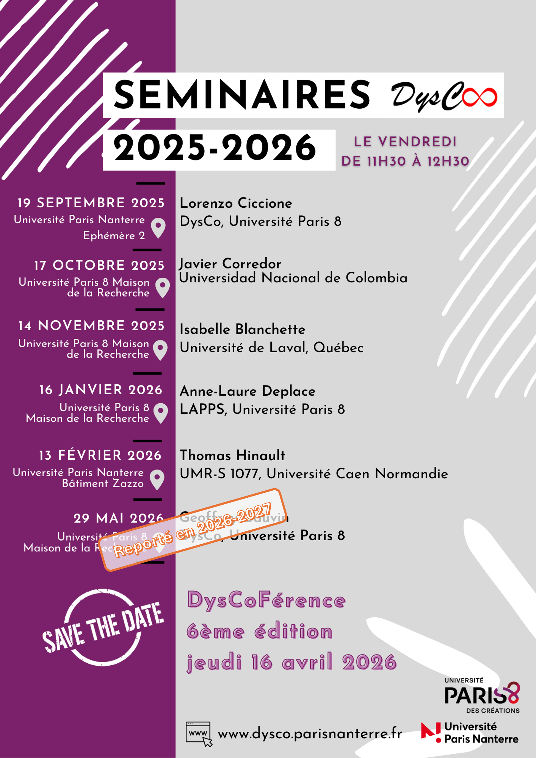 Les séminaires DysCo de l'année 2025/2026 débuteront à partir du vendredi 19 septembre 2026.